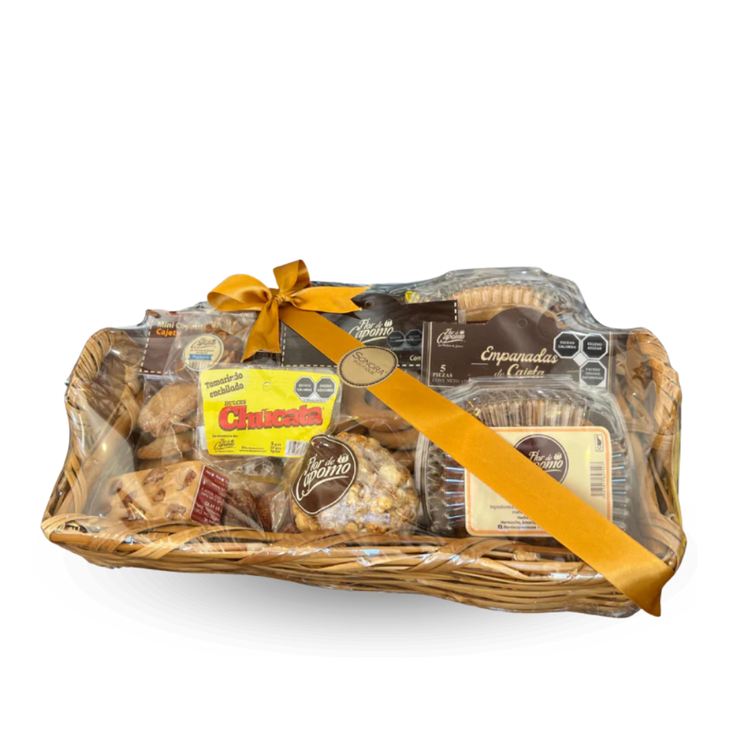 • 1 Carne Seca 100g. 1 Carne Machaca 200g. 1 Coyota Surtida con 4 pzs. 1 Coyota de Piloncillo con 4pzs. 1 Mini Coyotas de Cajeta en bolsa con 10pzs. 1 Mini Coricos con 20pzs. 1 Empanadas de Cajeta con 5pzs . 1 Ponteduro Mediano 35g. 1 Besito de Nuez con 15pzs. 1 Tamarindos Enchilados con 5pzs. 1 Jamoncillo Barra 75.