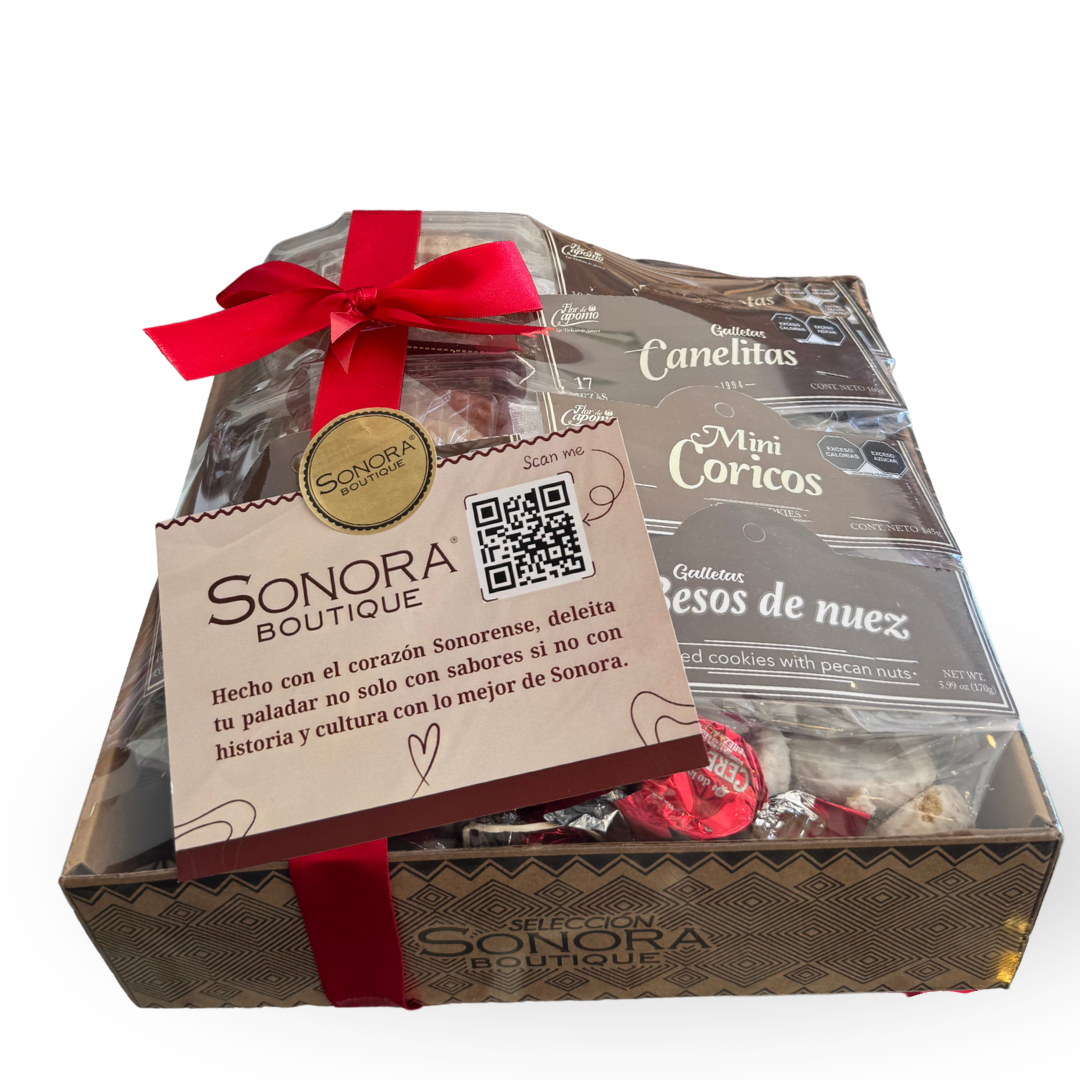• 1 Coyotas Surtidas con 4pzs. 1 Coyotas Piloncillo con 4pzs. 1 Mini Coricos con 20pzs. 1 Empanadas de Cajeta con 5pzs. 1 Mini Coyotas de Cajeta con 10pzs. 1 Canelitas con 17pzs 1 Besitos de Nuez 15pzs.