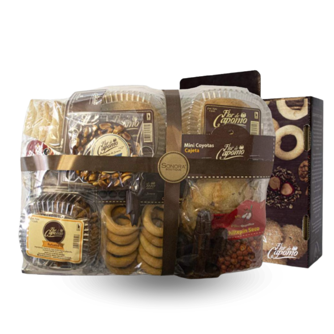 • 1 Carne Machaca 100g. 1 Carne Seca 100g. 1 Coyotas Piloncillo con 4 pzs. 1 Coyotas Jamoncillo con 10 pzs. 1 Mini Coyotas Cajeta con 10 pzs. 1 Empanadas cajeta con 5 pzs. 1 Besitos de Nuez con 15 pzs. 1 Chiltepinero de Palofierro. 1 Chiltepín Seco de 30g. 1 Mini Jamoncillo.