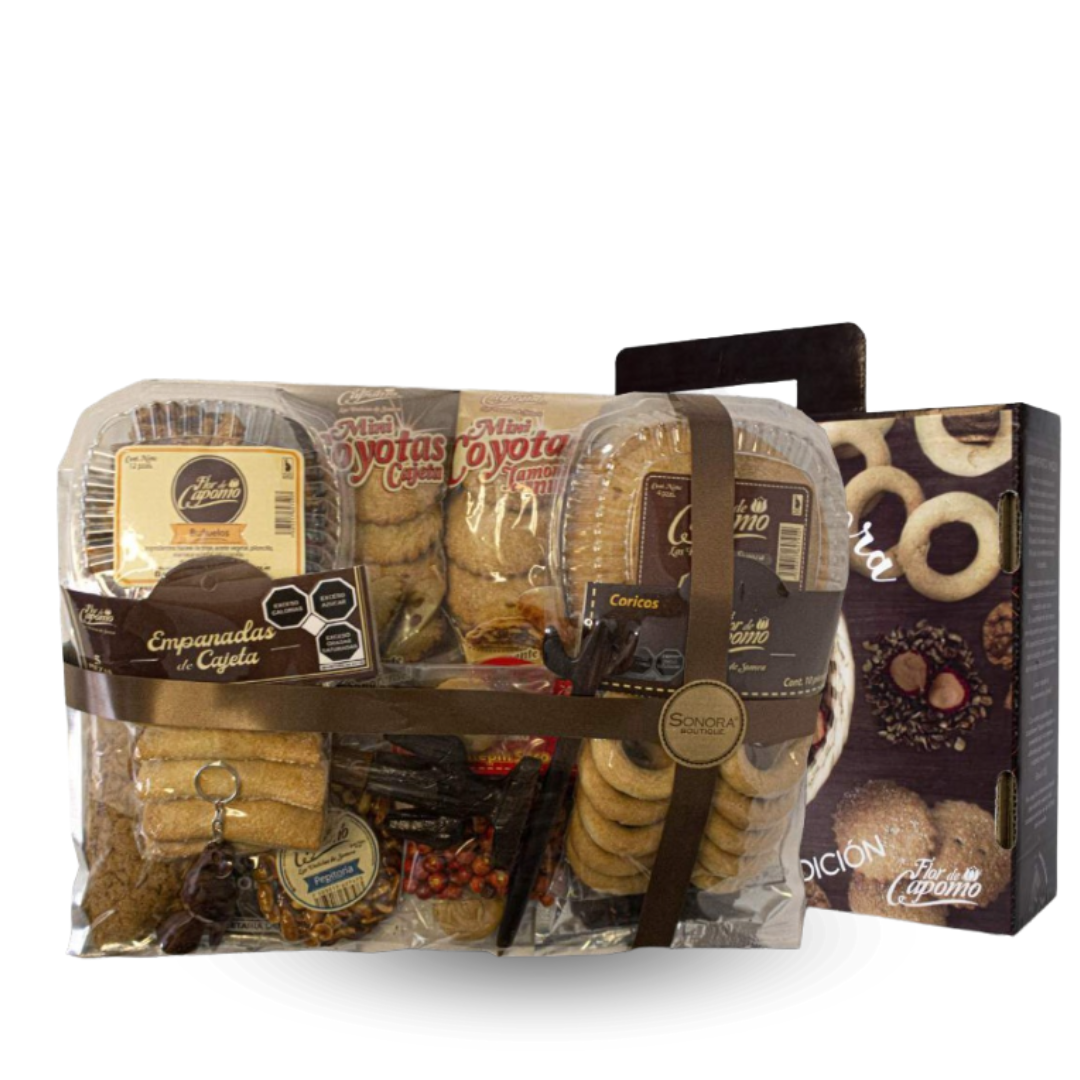 • 1 Carne Machaca de 100g. 1 Carne Seca de 50g. 1 Mini Coyotas de Cajeta con 4pzs. 1 Coyotas Surtidas con 4pzs. 1 Coyotas Piloncillo con 4 pzs. 1 Coyotas Jamoncillo con 4pzs. 1 Empanadas de Cajeta con 5pzs. 1 Chiltepinero de Palofierro. 1 Chiltepín Seco de 10g. 1 Mini Jamoncillo.