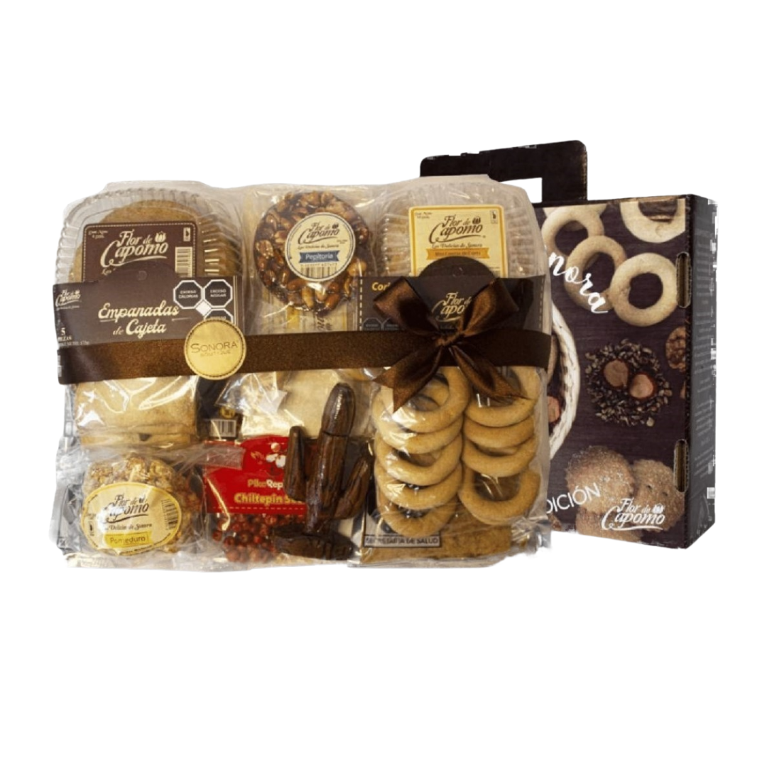 • 1 Carne Machaca de 50g. 1 Carne Seca de 35g. 1 Coyota de Jamoncillo con 4 pzs. 1 Coyota de Piloncillo con 4 pzs. 1 Mini Coyotas de Cajeta con 10pzs. 1 Empanadas de Cajeta con 5pzs. 1 Minicoricos con 20pzs. 1 Chiltepinero de Palofierro. 1 Chiltepín Seco de 10g. 1 Mini Jamoncillo.